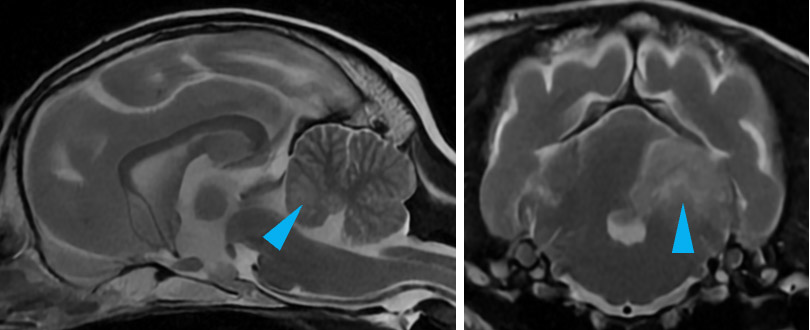 犬猫において頭蓋内の疾患は様々であり、外傷、先天性の形態異常、髄膜脳炎、脳血管障害、脳腫瘍等、多岐に渡ります。頭部MRI検査を行うことで、頭蓋内疾患を診断することが可能です。頭蓋内圧亢進は、生命に関わる緊急疾患であり、早期に診断を行うことが非常に重要となります。
